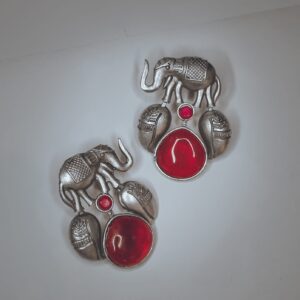 Vintage Style Oxidized Elephant Red Monalisa Stone Women's Earrings