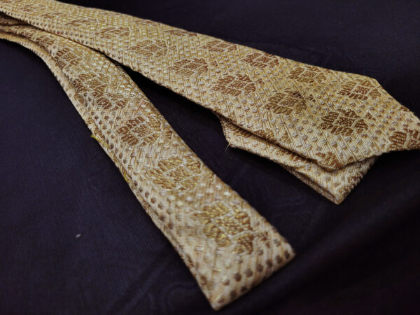 DESCRIPTION : Made of 100% Brocade silk, this necktie features a stunning floral design in rich colors that will make you stand out from the crowd. This necktie is handcrafted from ‘Varanasi’ brocade silk, a fabric that has a history of being used by royalty and nobility. This subtle pattern adds texture and depth to the smooth silk. The necktie is a masterpiece known for its exquisite craftsmanship and durability And showcases a ‘Varanasi’ motif that is both classic and contemporary. ‘Varanasi’ brocade silk neckties are elegant and luxurious accessories that can add a touch of sophistication and style to any outfit.