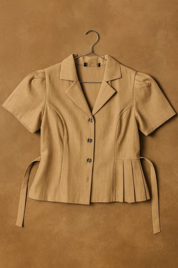 Da Kasha’s Beige Pleated Button Down Top is beige short-sleeved top is where thoughtful tailoring meets understated elegance. With its structured notched collar and crisp button-down front, it evokes timeless charm—but the magic is in the details: asymmetric pleating on one side and soft ties that cinch just right, creating a silhouette that flatters and feels free.