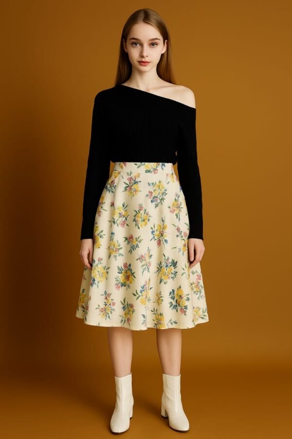 Styling Tips: For summer charm, pair with a white cotton blouse and woven flats , Transition into autumn with a rust-toned knit sweater and suede ankle boots . Elevate the look with a structured blazer and metallic heels for garden party chic. Add statement earrings or a jute sling bag to highlight the skirt’s botanical flair.