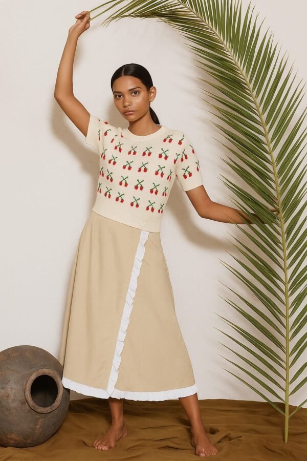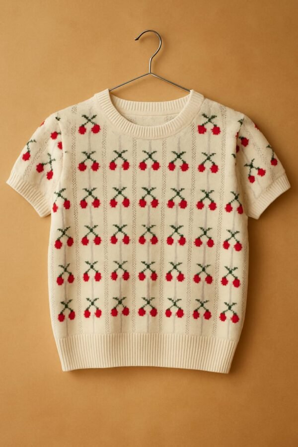 Da Kasha’s Cherry Knit Top is add a pop of playfulness to your sunny day wardrobe with this white-colored knitted summer top. Scattered with rows of vibrant red cherries and fresh green stems, this piece balances whimsy with structure. Its soft texture, breathable structure, and subtle ribbed finish make it an ideal pick for warm days and breezy evenings.