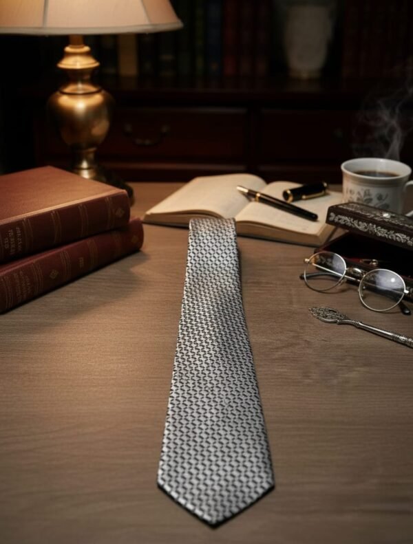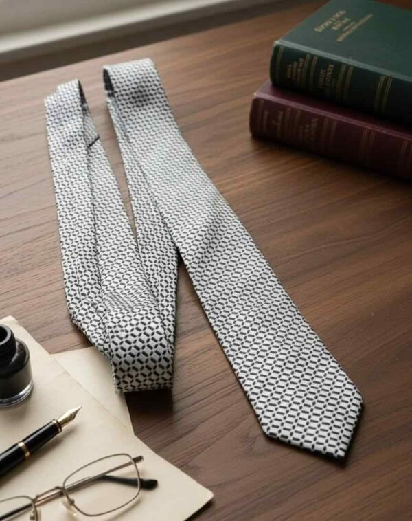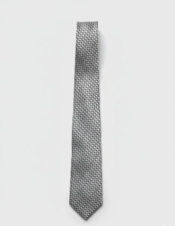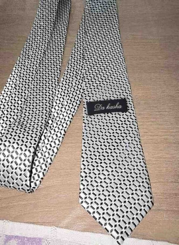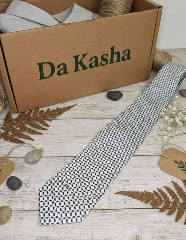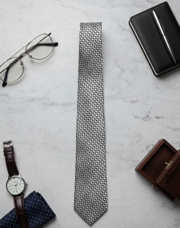 DESCRIPTION: At Da Kasha, every creation is more than an accessory—it is a statement of identity. This silver-gray necktie, adorned with a precise geometric grid, reflects the harmony between tradition and modernity. This silver-gray necktie embodies modern sophistication with a timeless appeal. Its design features a repeating geometric grid of dark accents, creating a subtle yet striking contrast against the smooth, lustrous base. Crafted for the discerning individual, this tie is not just worn—it is experienced. Whether in the boardroom, at a wedding, or during a celebration, it becomes a quiet emblem of sophistication, carrying the wearer’s story with grace.
