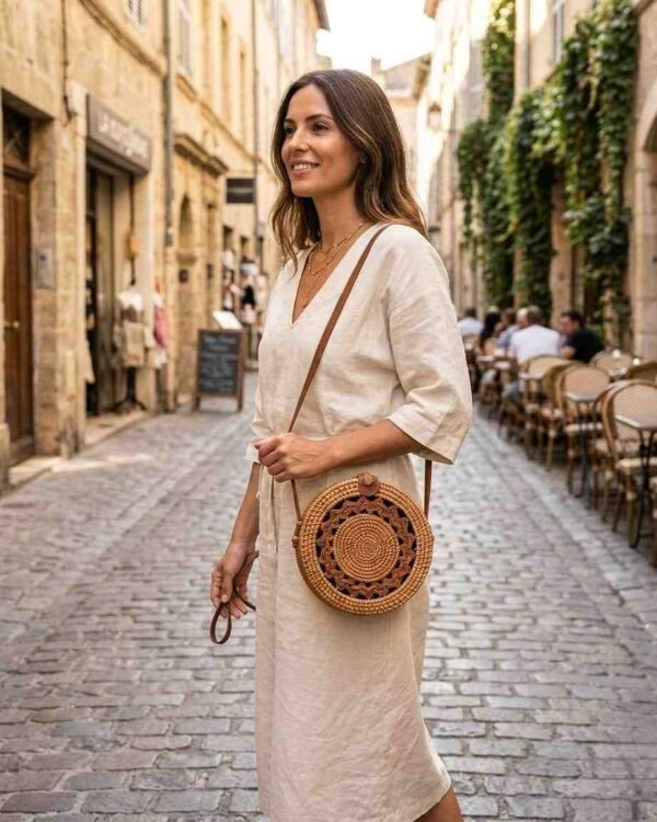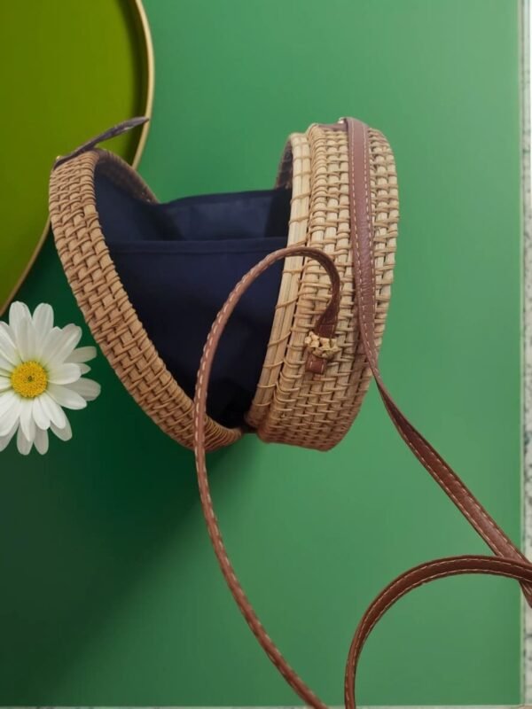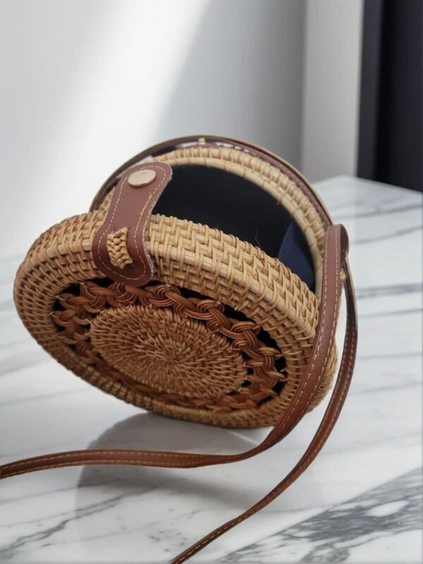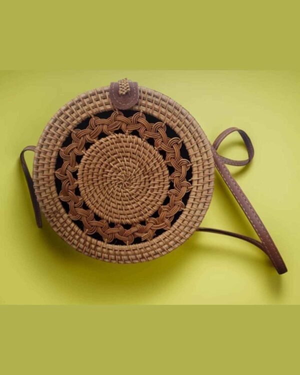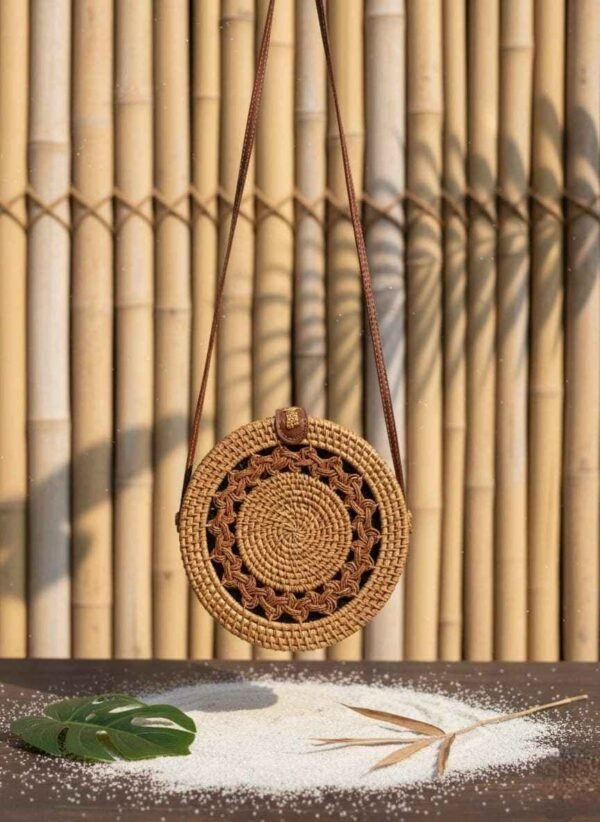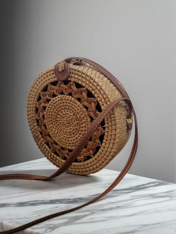DESCRIPTION: Da Kasha Handbag: A Timeless Fusion of Art and Fashion. Celebrate artisanal craftsmanship with this beautifully woven round rattan handbag, designed to bring tropical charm and eco-friendly elegance to your everyday style. Its intricate circular weave blends tight and open patterns, creating a striking texture that feels both timeless and modern. The long brown leather strap adds comfort and versatility, making it perfect for casual outings, beach strolls, or city adventures. This bag is more than an accessory—it’s a statement of sustainable fashion, crafted with care to highlight natural materials and traditional weaving techniques.