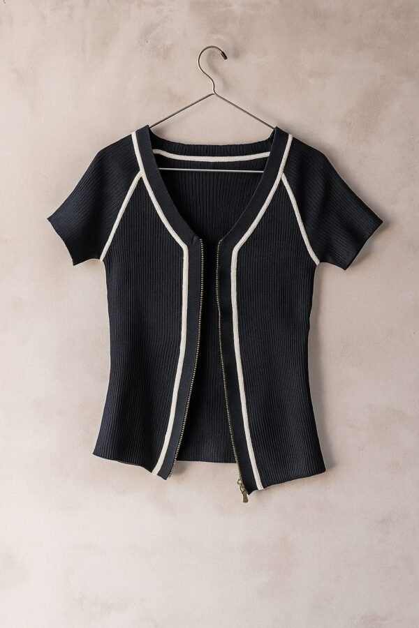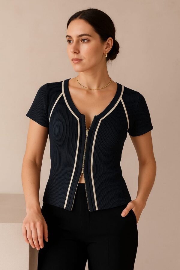 Da Kasha’s Monochrome Zest Ribbed Knit Top is Step into a rhythm of sharp contrasts and smooth textures with this black ribbed knit top, outlined in creamy white piping that carves confidence into every curve. The front zipper isn’t just functional—it’s your style switch. Zip it up for streamlined sharpness, or wear it open to reveal layered nuance.