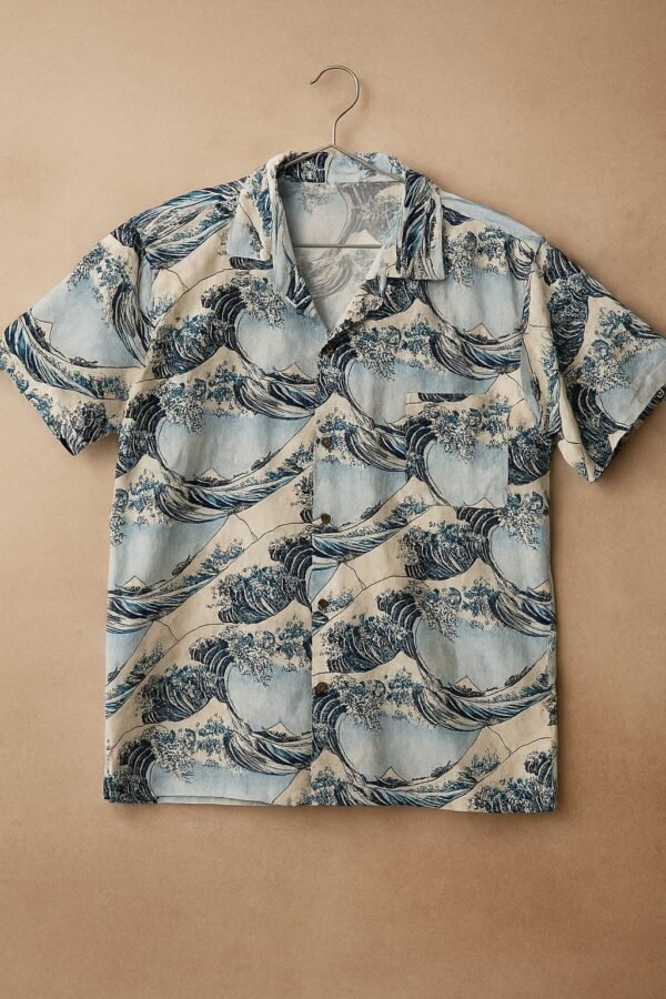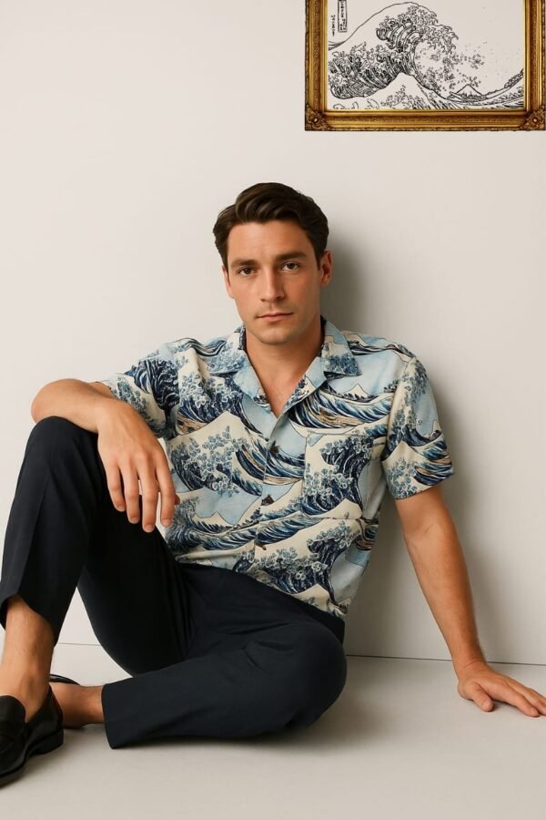 Da Kasha’s wave-print shirt finds its muse in one of the most iconic artworks in Japanese history—“The Great Wave off Kanagawa” by Katsushika Hokusai.